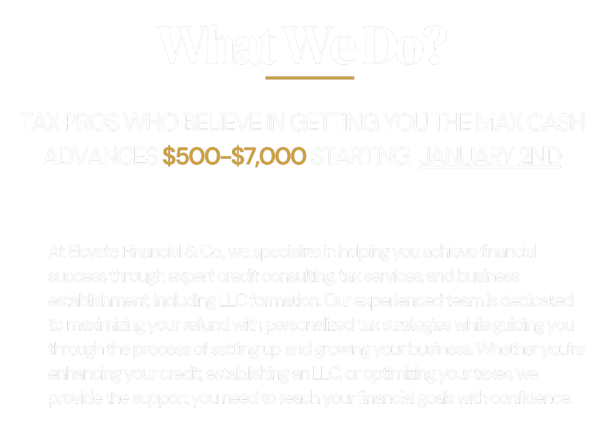 At Elevate Financial & Co., we’re dedicated to helping you achieve your financial goals through personalized, expert guidance. Our team brings over 10 years of experience delivering exceptional customer service while leveraging a range of strategic solutions, including credit consulting, tax strategies, and business establishment, to optimize your financial position.